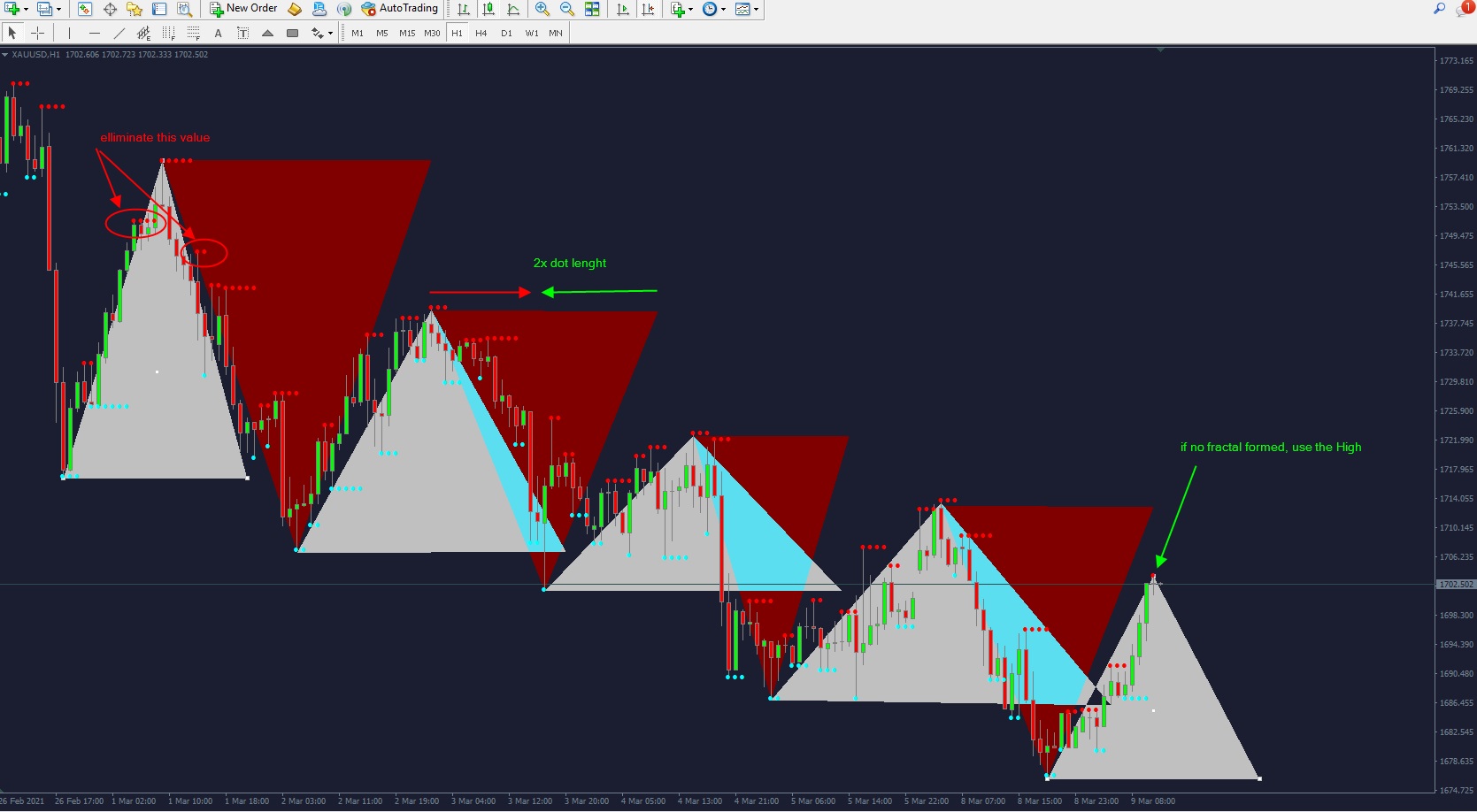 1. Elliminate double fractal ( 1 up fractal 1 vs down fractal each side)