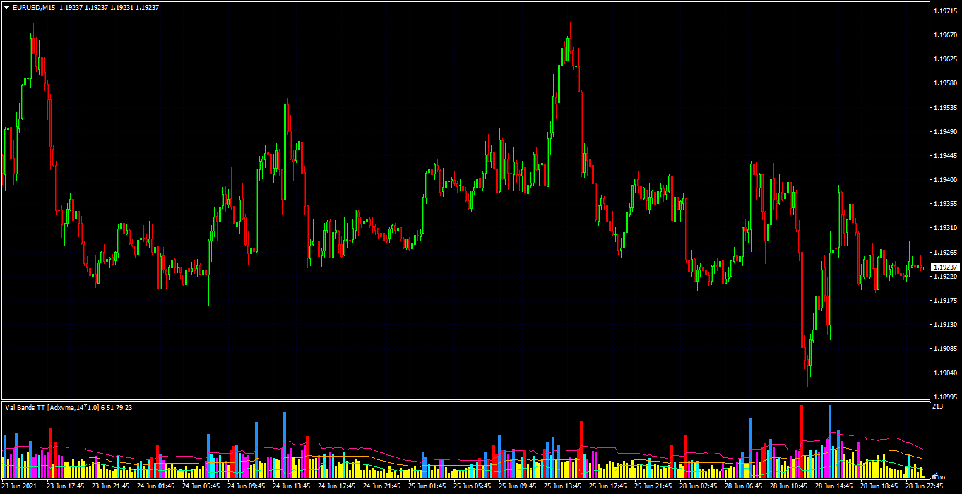 If the Val-Bands histogram shows a yellow bar and is below the lowest line, it shows that market is flat (ranging).