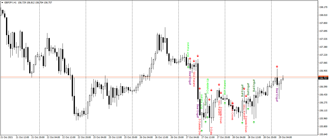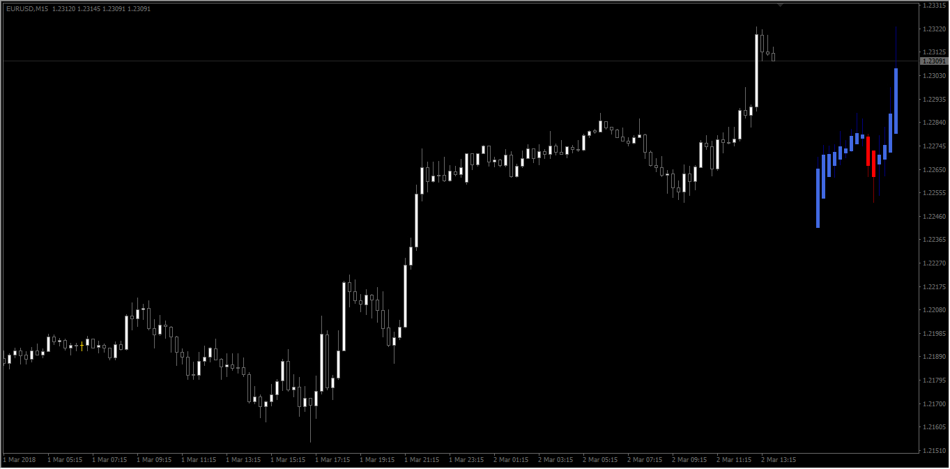 The indicator shows the Higher timeframe candles on the Current chart. Candle colors are selected according to Four different calculation methods.