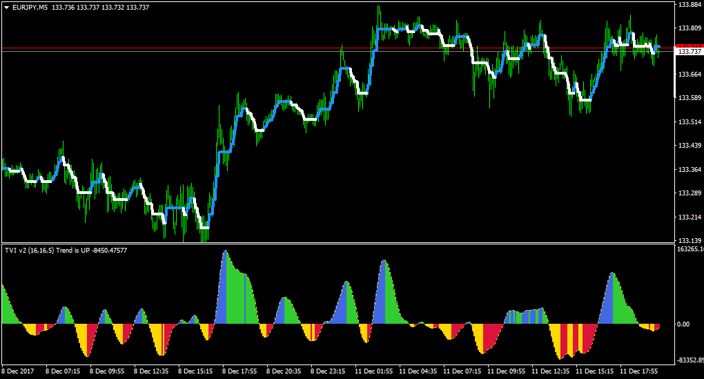 - TVI bar color change is a signal to enter the market. When the TVI changes from yellow to red, it is a signal to buy and if the TVI bar changes from blue to green, it is a signal to sell.