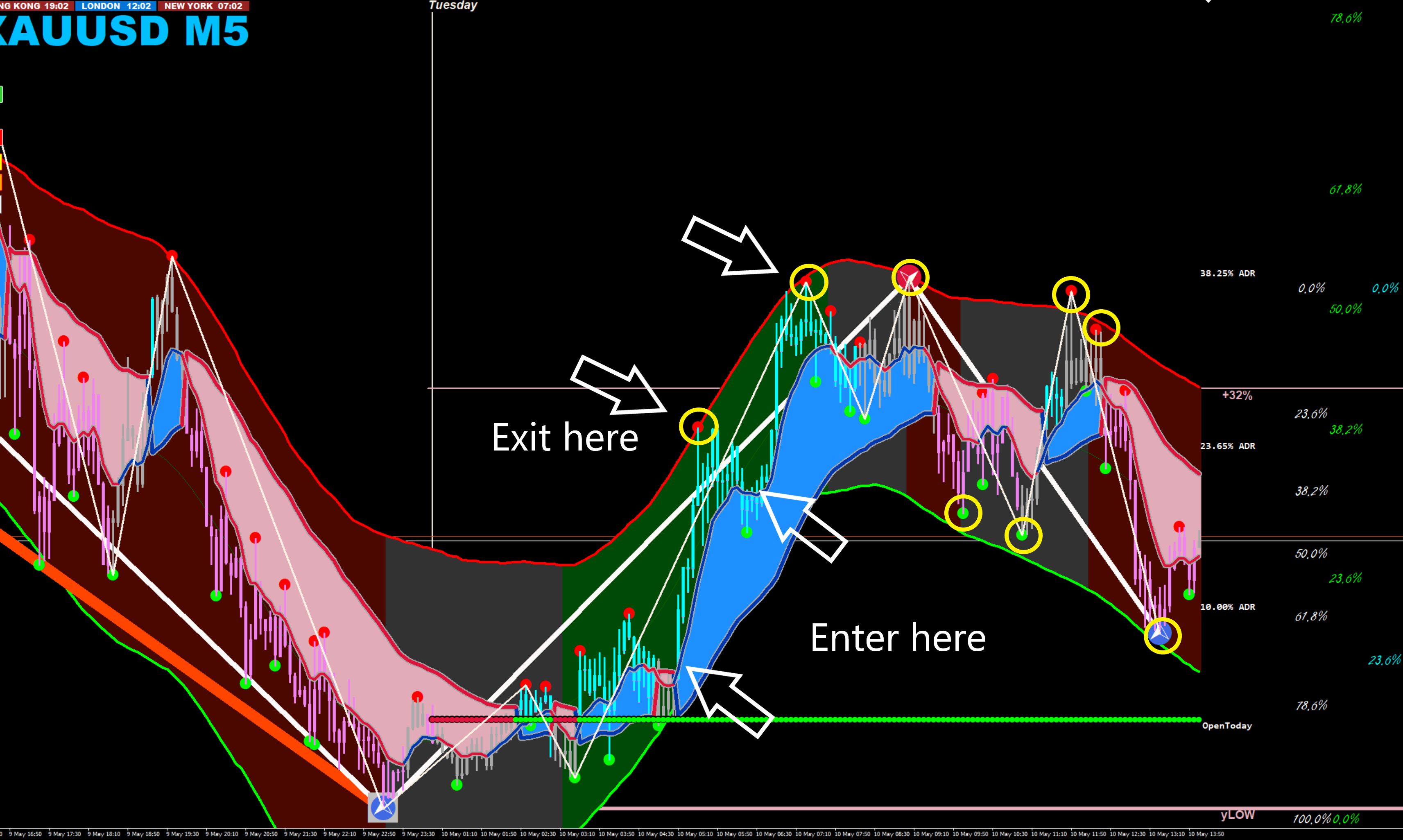 The green circles indicate entries and the yellow take profit, last TP was at the 61.85 ADR level. 38.25ADR is also a good place to be taking profit.