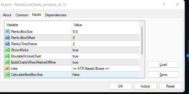 In the EA "RenkoLiveCharts_pimped_v4_13" is the box size 5 or 50?