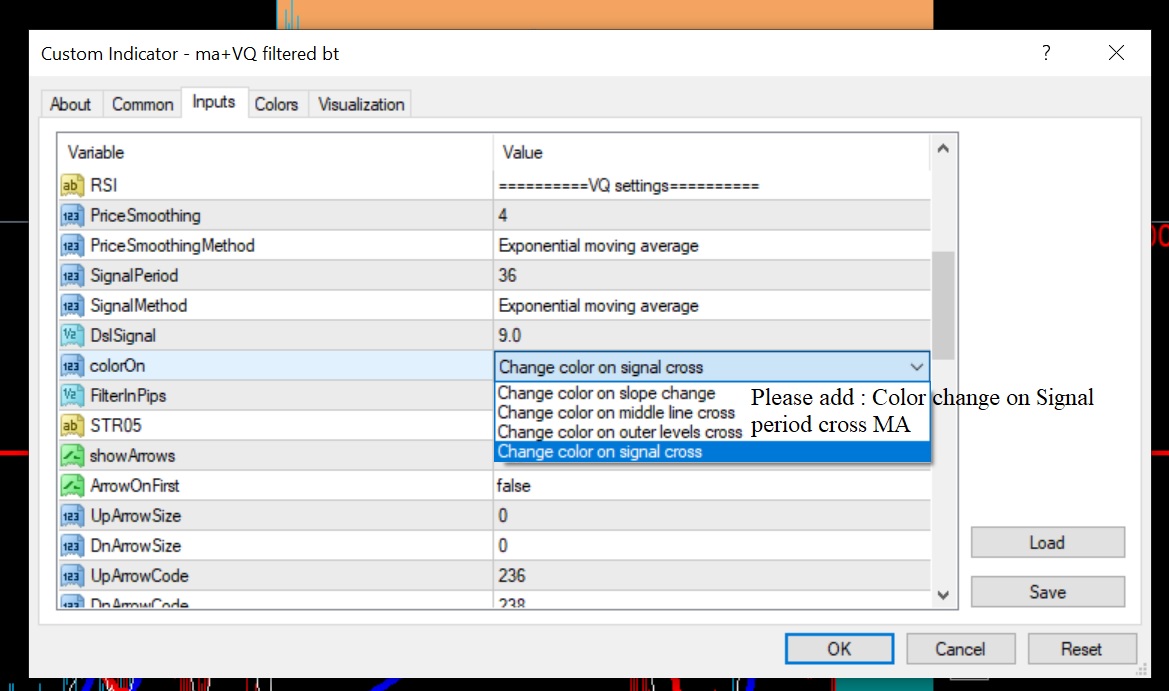 I hope your doing fine, first of all a big thanks from my bottom of my heart, the work ,and the contribution you provide to the community is great, people like you and mr.tools are blessing for beginner traders like me. I started using your MA + VQ Filtered Bt indicator, it works great, could you please add an option for color changing, my request is please add an option for Color change on signal period cross MA, just like your MA + RSI filtered there is an option for color changing stating Color change on RSI cross MA, similarly here also please provide an option like Color change on signal period cross MA in MA + VQ Filtered BT indicator. For your reference iam adding images. Thank you.