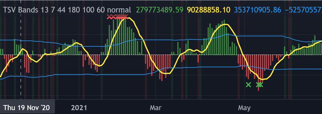 plotshape(tsv < (avg_outflow * (tsv_bands_excess_low / 100 + 1)), title="Buy", color = color.green, style=shape.xcross, location=location.bottom, size=size.tiny)