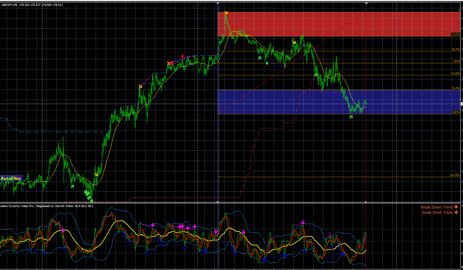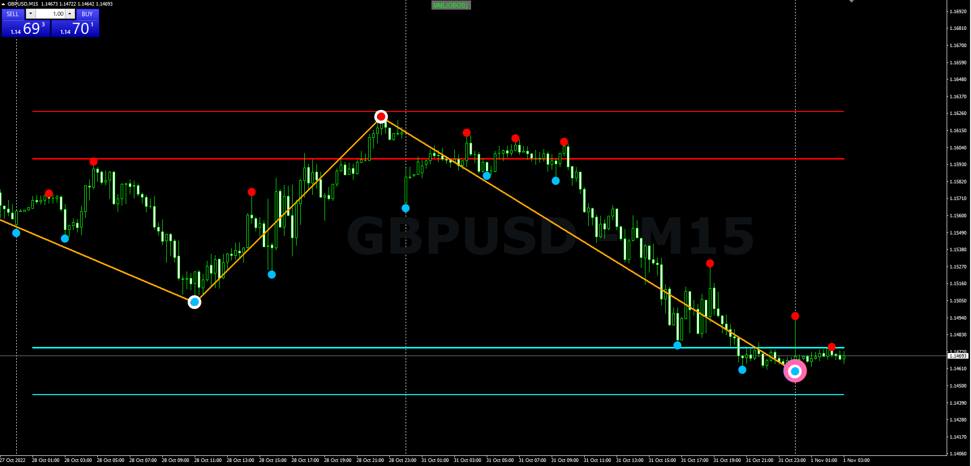 Like in your screenshot, if price moves down to form a lower low (lower than the white-blue dot), then we could see a sell trend.. it could be a short pullback though... Price could go down to form a blue arrow to take it back up, or you'll see several white-pink dots pushing price down until you get that big arrow-suqare.