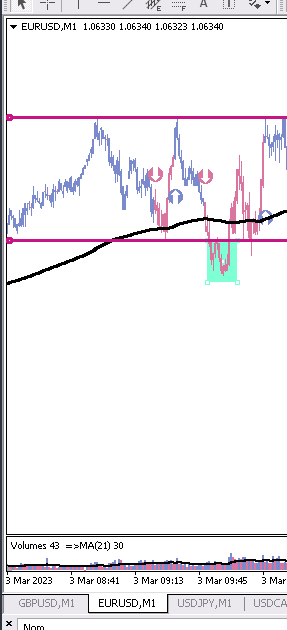 2 : the indicator shows pink canldes, which mean EMA 21 was below EMA 55. I use the lowest candle of this period as the bottom of the V shape.