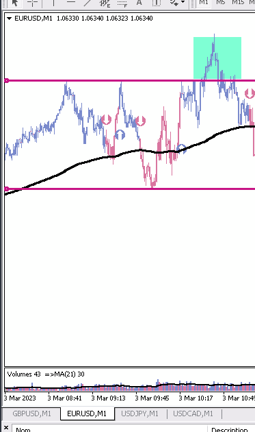 1 : the indicator shows blue candles, which mean EMA 21 was above EMA 55. I use the highest candle of this period as the pike of the mountain.