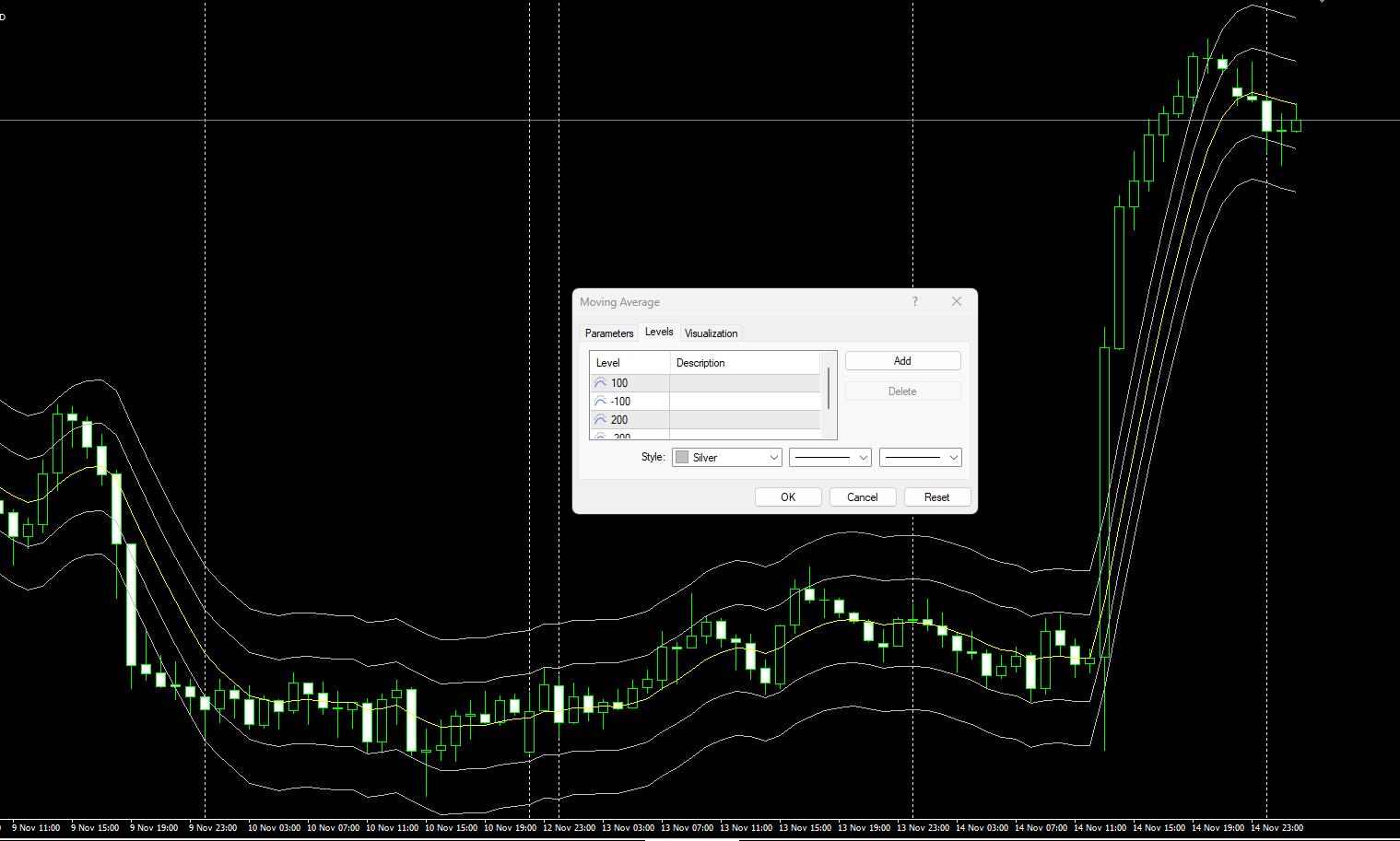 - Take that number of pips between the two and then duplicate that distance away from the High and Low to form "High2" MA, "Low2" MA, etc, according to how many levels of deviations you want.