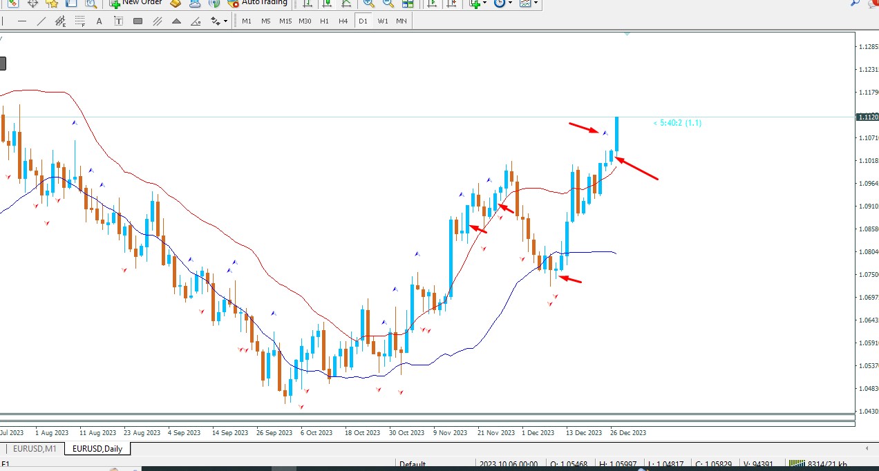 up arrow confirmed at close price BULLISH bar - next bar is bullish trend when the arrow bar is above BB upper line