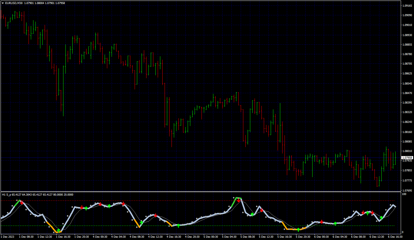 If you set ColorOnSlope = false, then alerts, coloring, and arrows will be on when stochastic crosses signal.