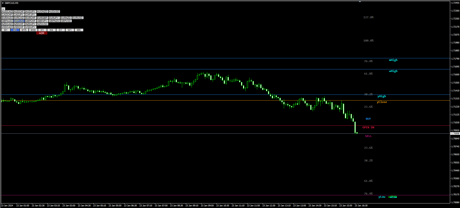 I updated this indicator a little by adding the weekly open, weekly hi & low and monthly hi & low levels. Of course I also added options to turn those new levels on/off with, show_Wk_Open, show_Wk_Openline, ShowPrev_WkMth_HiLo and ShowPrev_WkMth_HiLolines. Those new options are all on by default. However, if the lines and line labels are on and you change to different chart, the new labels will be displayed but their lines won't display. You will have to click the ARD button twice to turn off then turn on for the lines to display. I couldn't figure out why that is happening but it's not a big problem.global wrote: Thu Jul 06, 2023 10:16 am Here is my new modified UT_XU-ADR D1_1.01_BT2.mq4. I added inputs that will now allow you to change all the "hard coded" colors. I also included comments within the code explaining how you can use the Modified Forex-Station button template sections within other indicators that draw buffer data you want to access by iCustom calls.