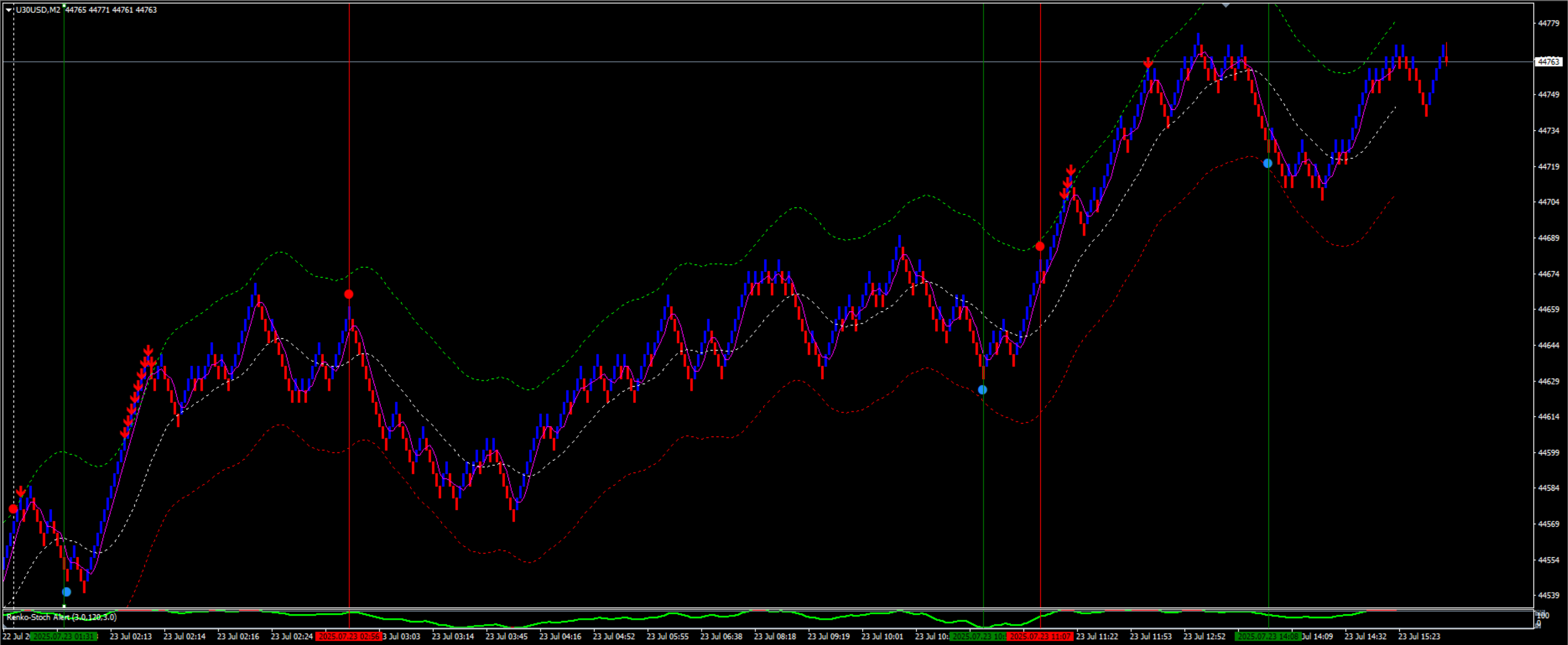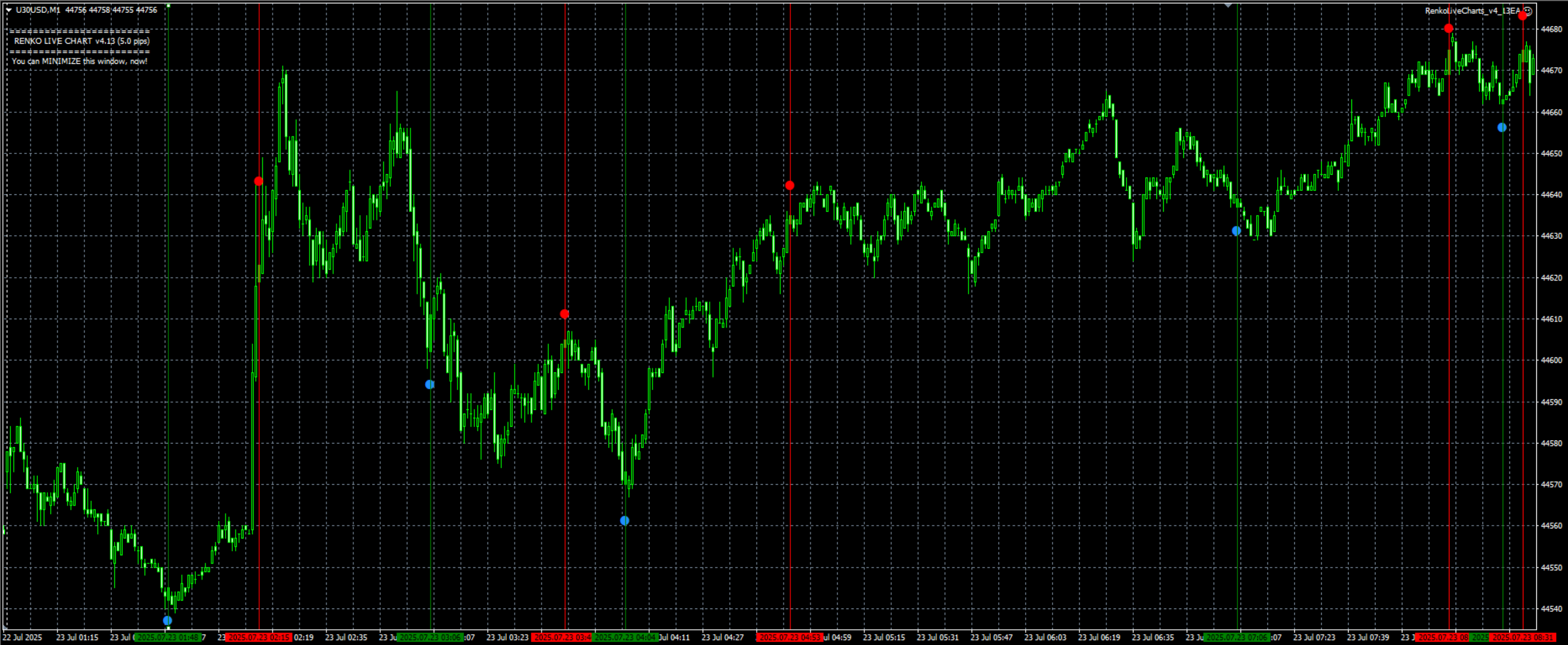 Weirdly enough, this is what I see for the 5-point-per-box Renko chart on US30 when I allow the indicator to run uninterrupted: