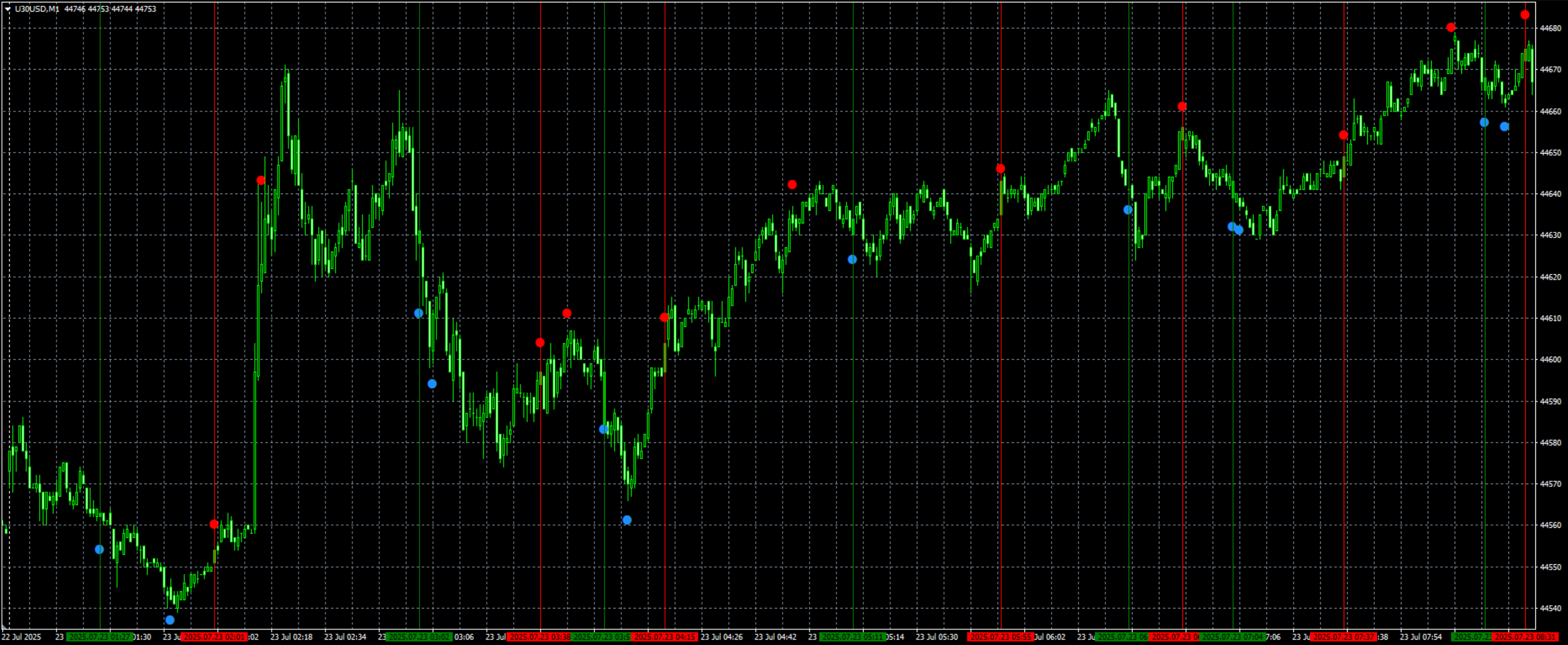 214I spent the last few hours yesterday having two US30 M1 charts side-by-side. I noticed that for the first few hours of post-close market activity, a buy signal didn't generate a profit if you exit at the red dot as I observed 100% of the time in past price action.