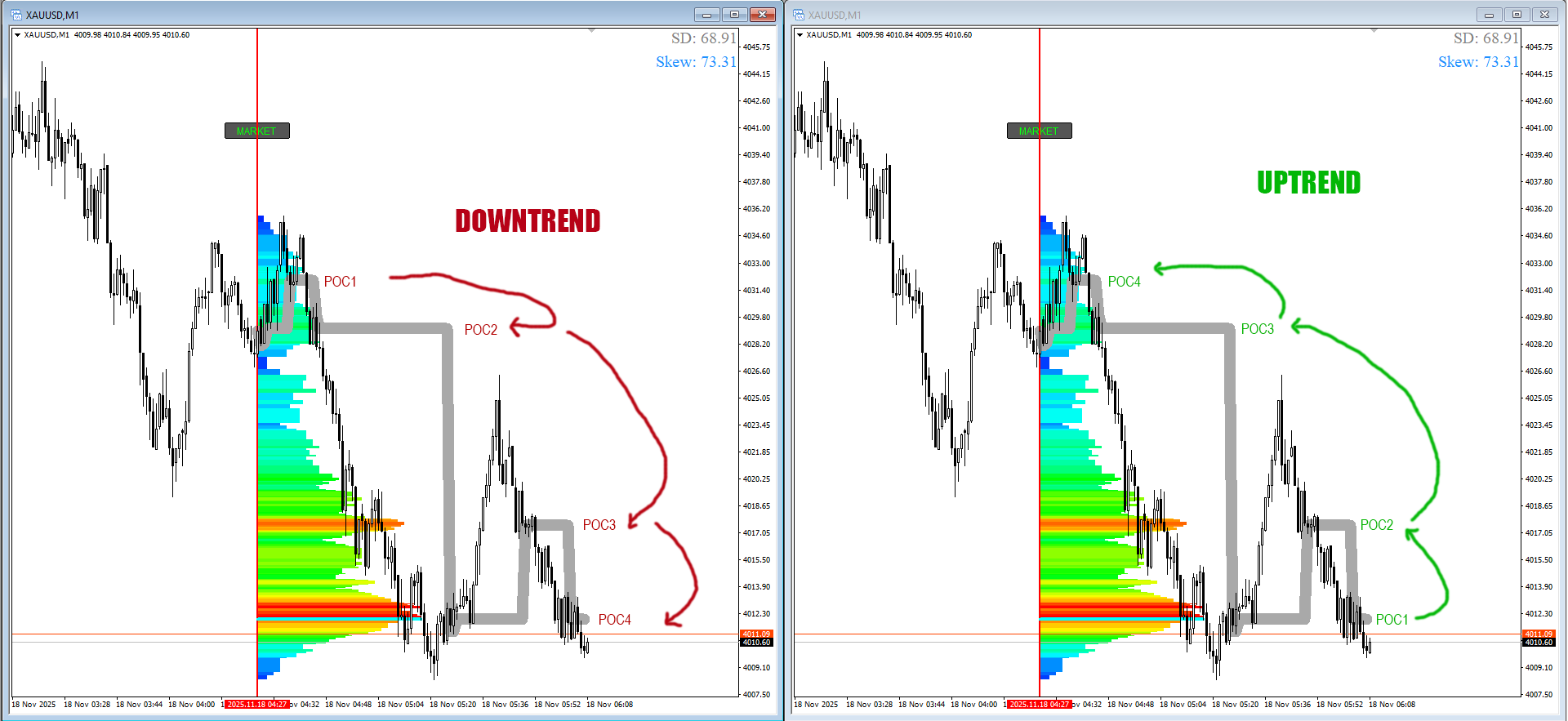 In an uptrend or downtrend, you trade from 1 level of POC to the next.
