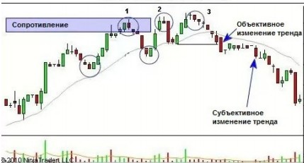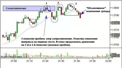 trend. In our case, this consolidation is below. When the price refuses to gain a foothold below the point of objective change in the trend, this may mean a failure to change the trend (and this is usually a good trading opportunity in the direction of the initial trend).