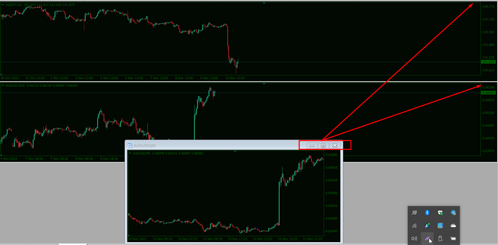 I got a real problem & it's beyond my MT4 capabilities. How do I get all the charts back like the lower chart pictured so that I can Max, min, or move around the individual charts,