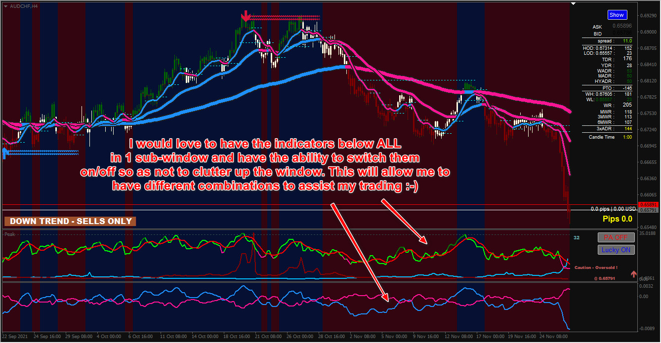Would it be possible to add buttons to the following indicators so that I can have them ALL in a single sub-window? Unfortunately, I do not have .mq4 versions of all the indicators. The HLC -Trend (alerts) rev001 is from XARD's XARDWORLD rev009. I have included 2 versions of the TDI - RT and I will leave it up to you to decide which one is the better candidate to be buttoned