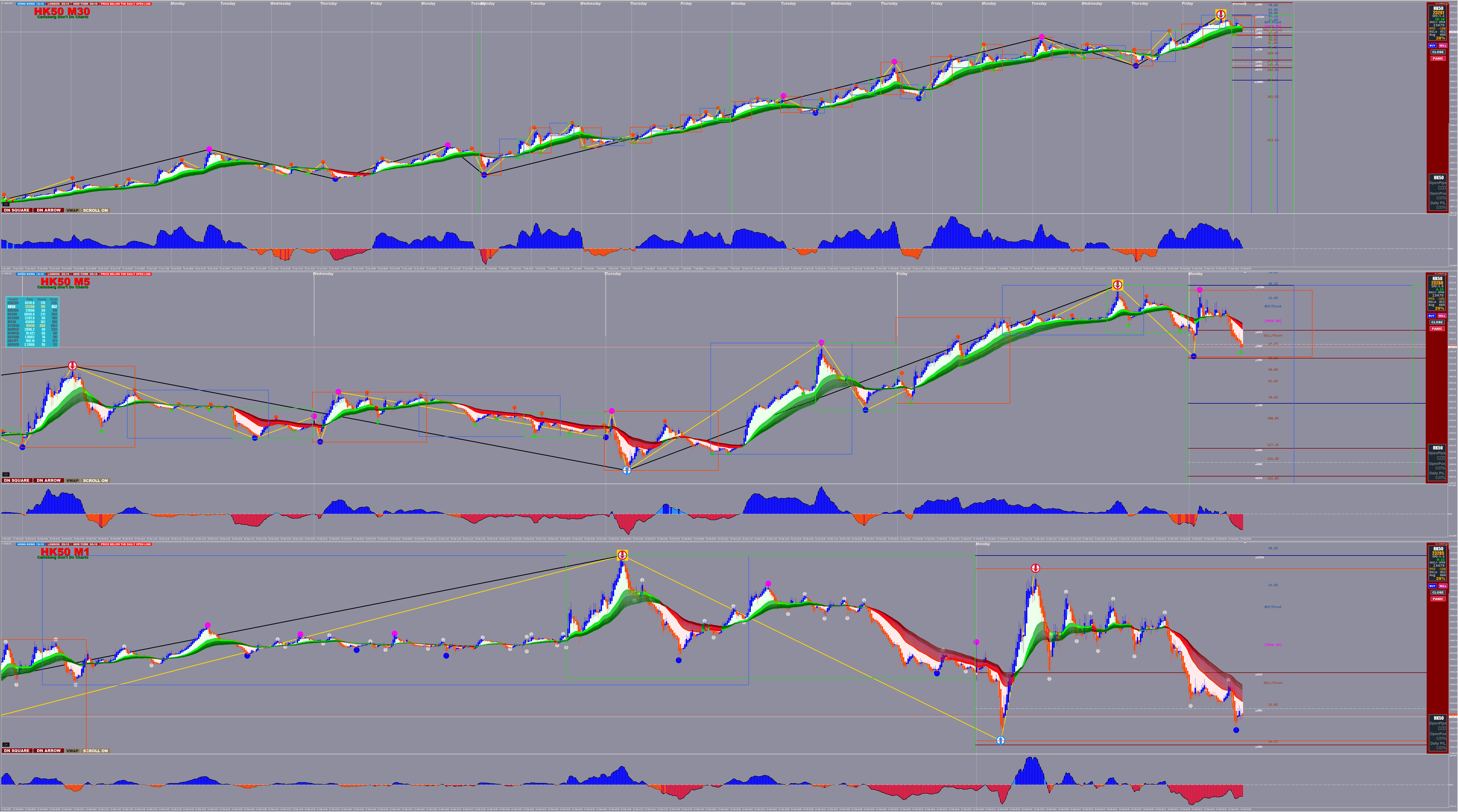 Semafor Dots: Multi-period dots (10, 50, 250, etc.) flag swing highs/lows. Bigger dots (e.g., S5, gold) on M30 confirm ZZ pivots; smaller ones (S1, green/red) on 5M time entries.