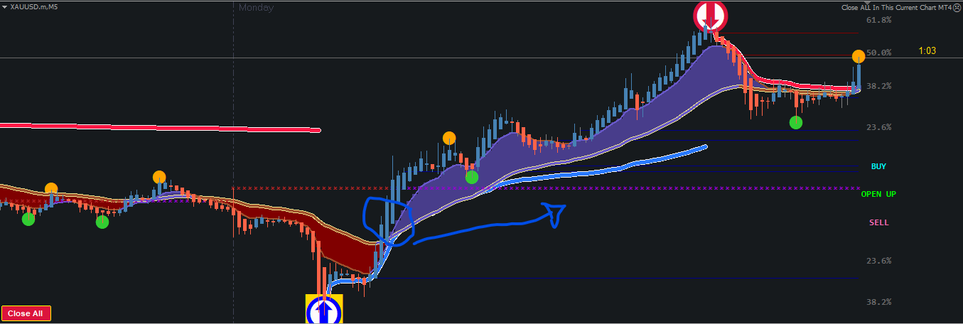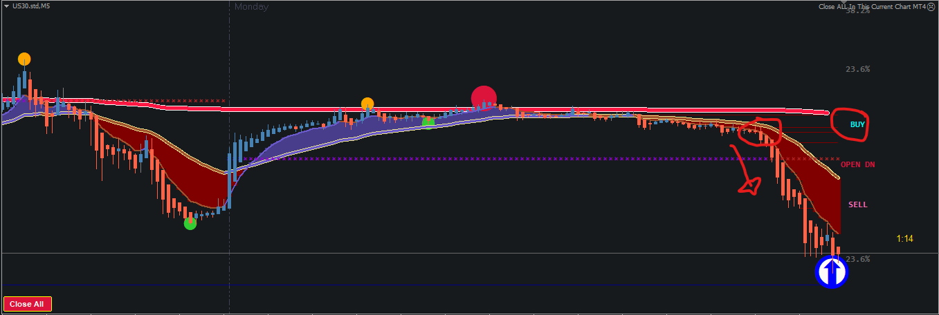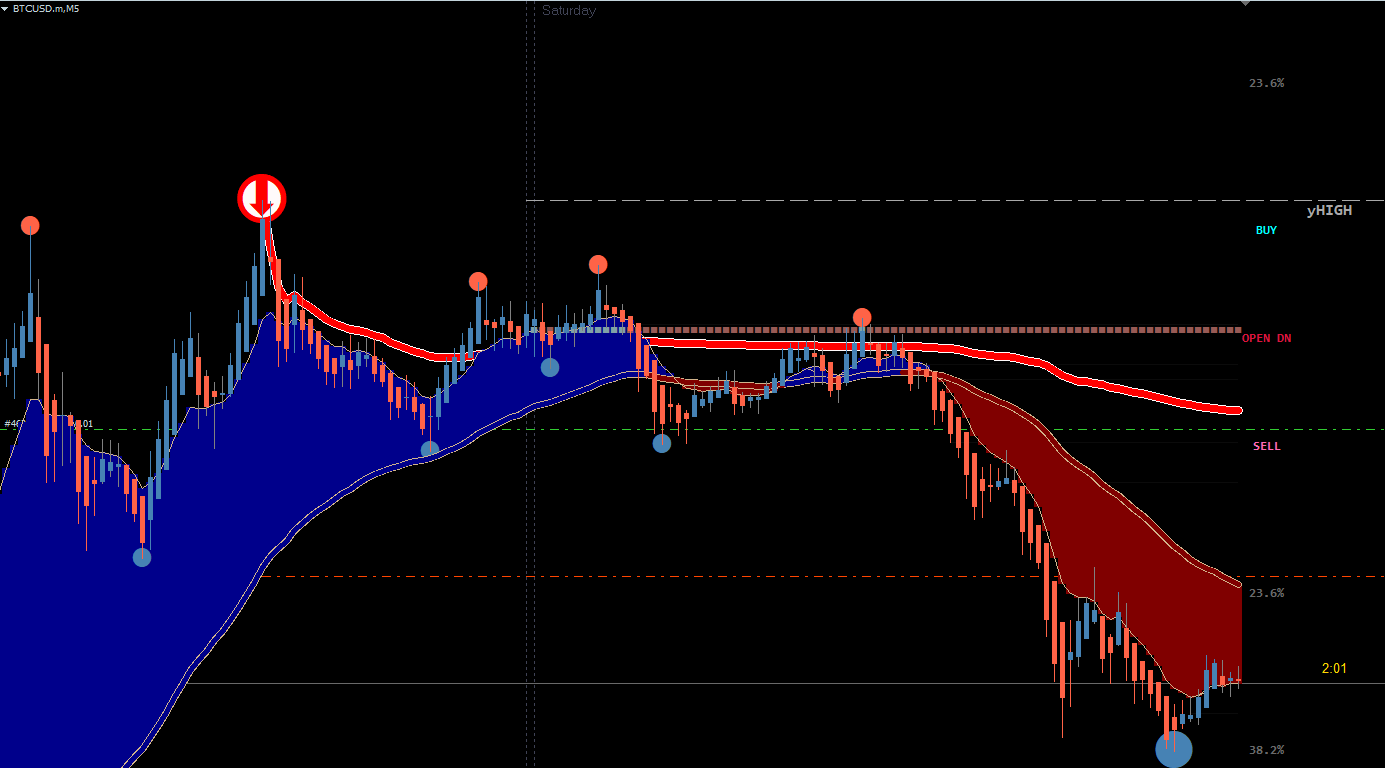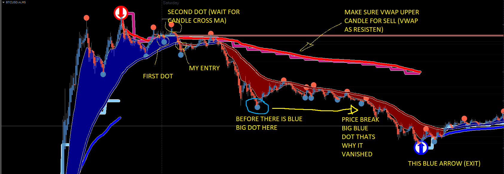 BTCUSD 5MIN, Trade Arrow Red to Big Dot Blue, then Red Big Dot to Blue Arrow.