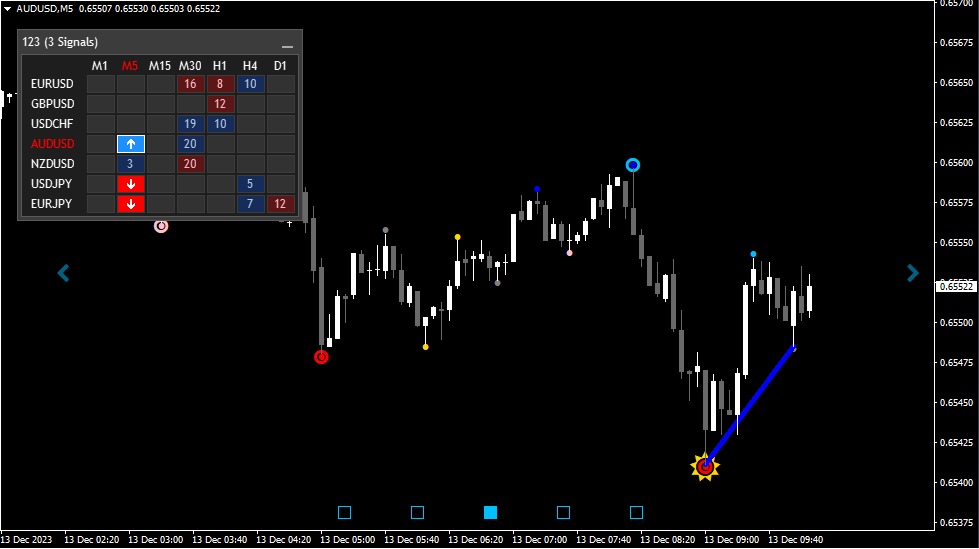 Using the multicurrency dashboard, you can track on which currencies the 123 pattern was found and how many bars passed after it.