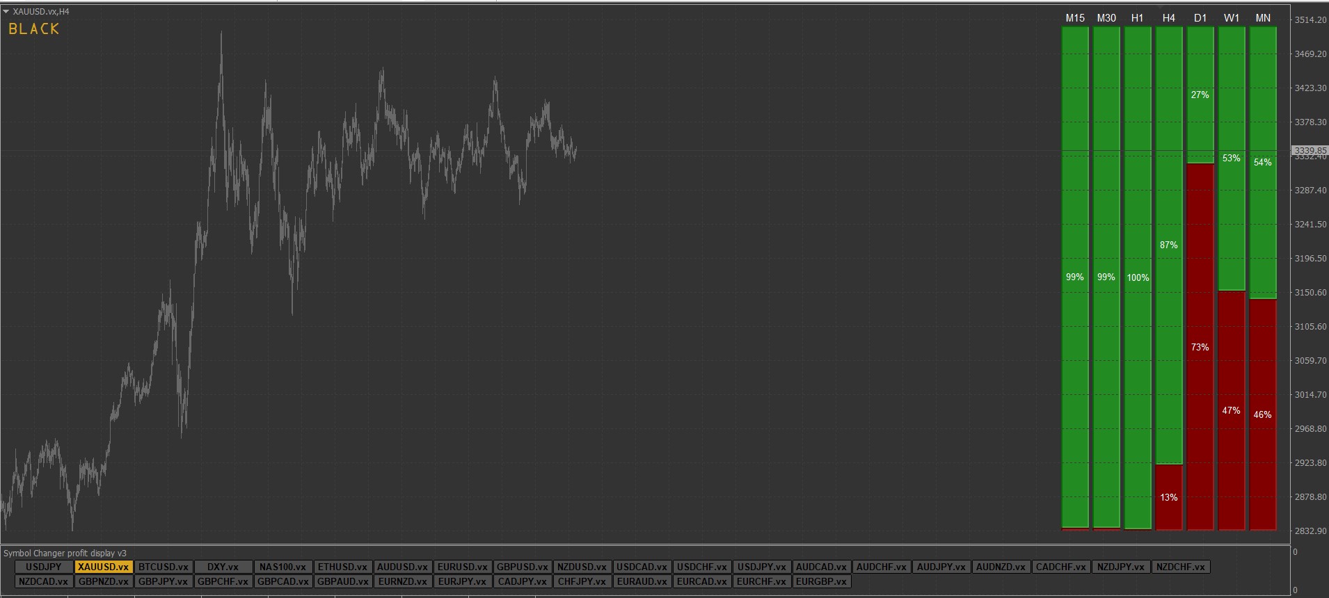 This indicator will display vertical bars on the right side of your chart, each representing a specific timeframe. Each bar is divided into two colored sections, showing the percentage of the current candle's range above and below the current price, respectively.