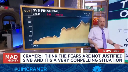 Silicon Valley Bank is fine. Jim Cramer on SIVB: "Stock's still cheap... I think the fears are not justified and it's a very compelling situation" - Feb 8, 2023