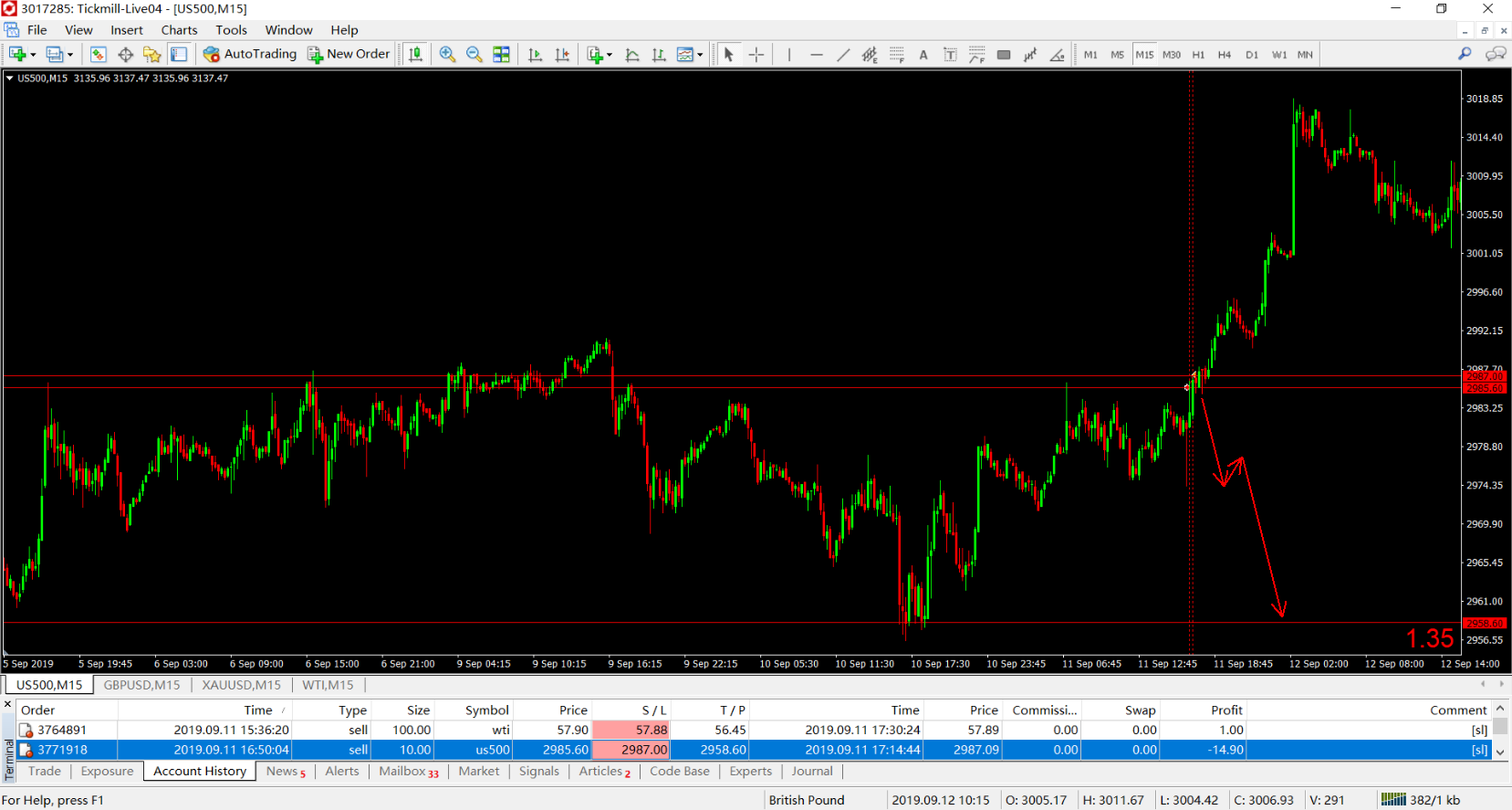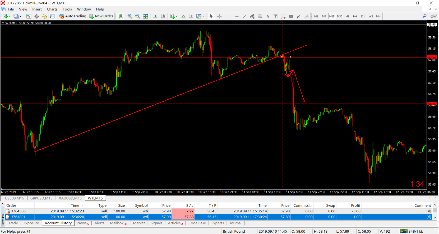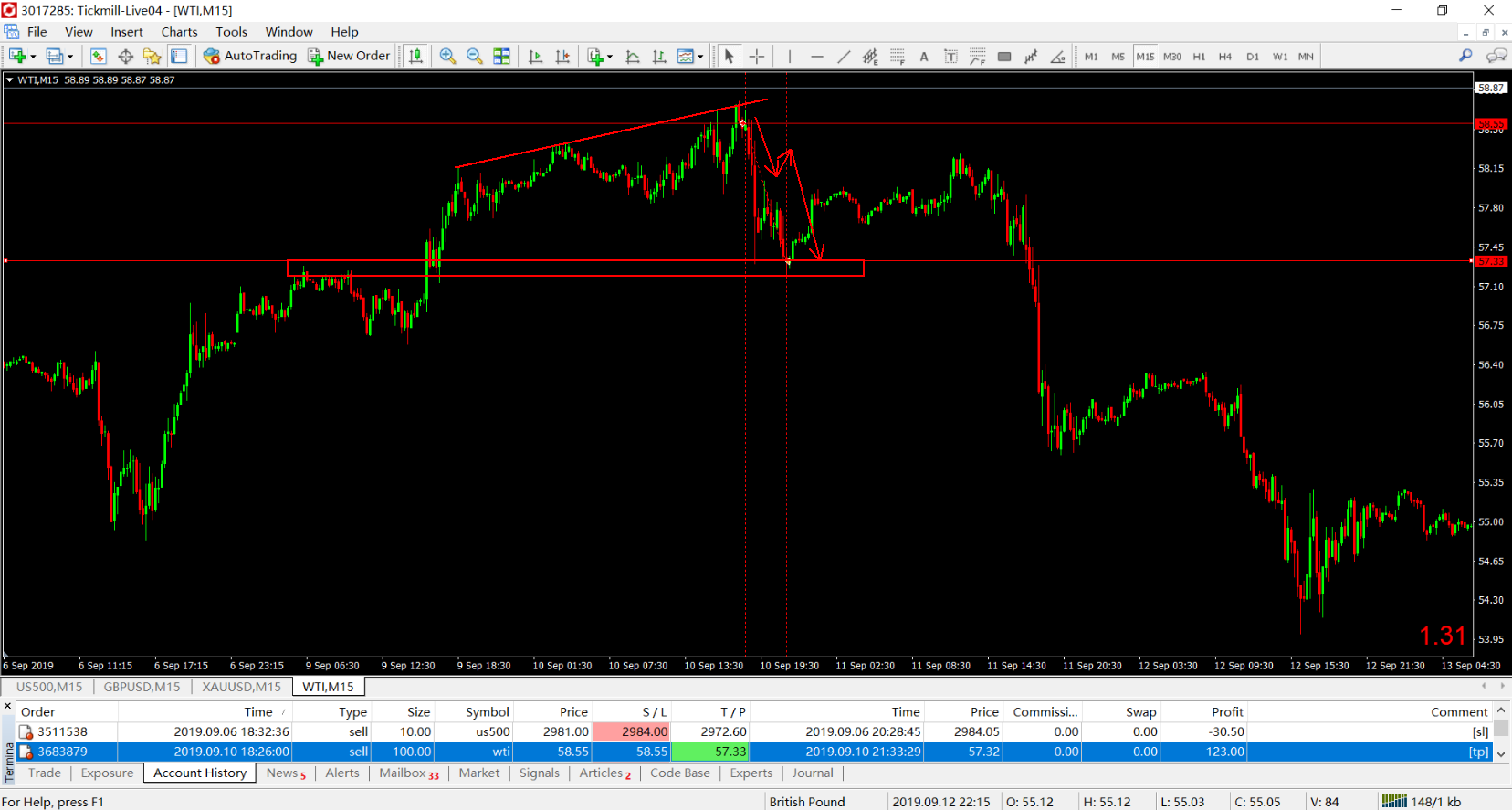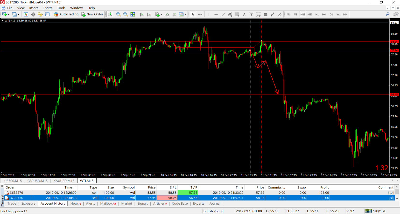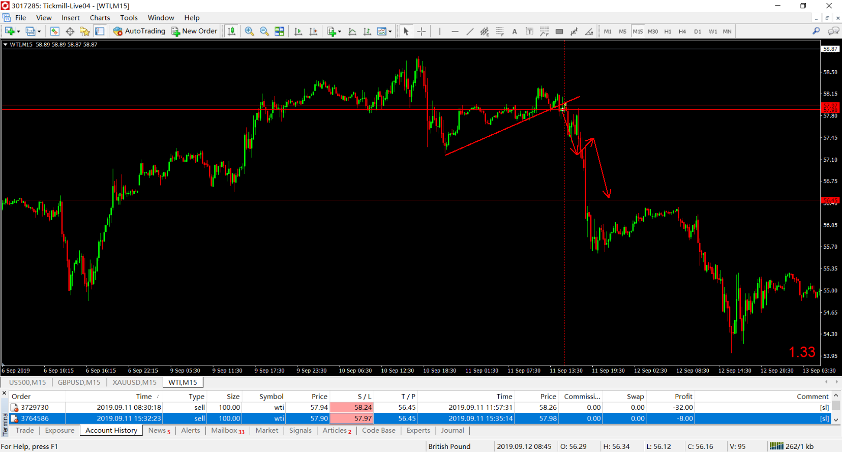 WTI: 4trades,-92pips, (SL)3trades,-92pips, (BE)1order+pips。