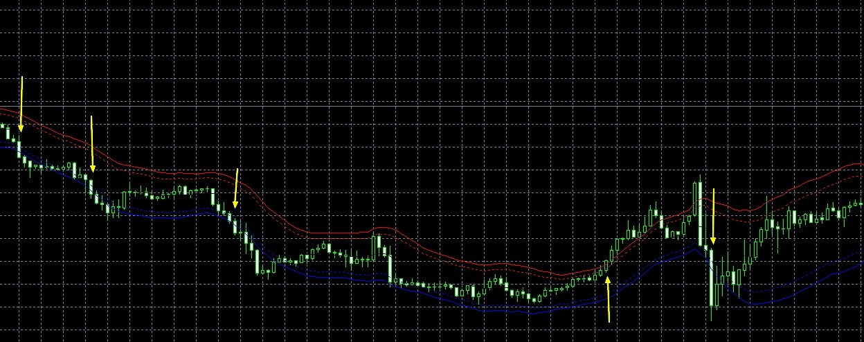 -Arrow at first candle(only) every break outside MA band,