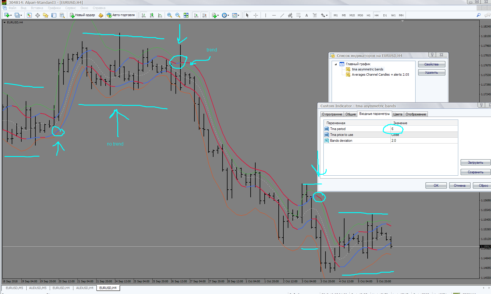 When you add a TMA highlow channel to the asymmetric TMA band with the same period, this is a good trend filter. If both borders are asymmetric TMA outside, then this is not a trend, when one border is inside a highlow channel, then this is a trend after crossing their borders.
