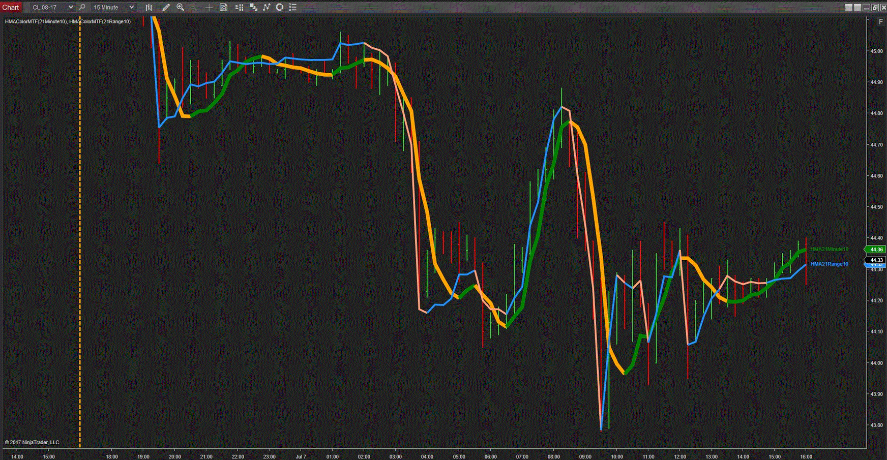 43The HMA can be calculated from any chart type and period (Multi Time Frame). In the picture is a 15M CL chart. It has two instances of this indie. One is an HMA21 calculated from a 10 min chart and the second is a HMA21 calculated from a 10Range. The indie title displayed on the chart shows the type and period info, as does the title in the user configuration panel. The HMA is completely configurable for color, drawing type HMA Period, Chart Type and Chart Period. There is a label in the right margin of the chart that identifies the indicator. Depending on the timeframes of the chart vs the HMA, you may need to enable Tick Replay in the Data Series.