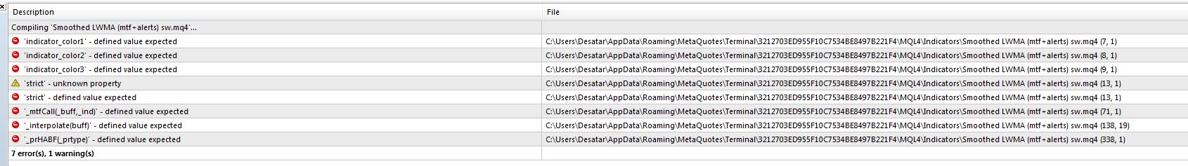 When I put the indicator on, I don't see any lines. When i compile it, it doesn't give me any errors and I still don't see any lines. But if I compile it with an older version (~~mql4Editor.build 509_v4.00.24), I get the following errors. See picture.