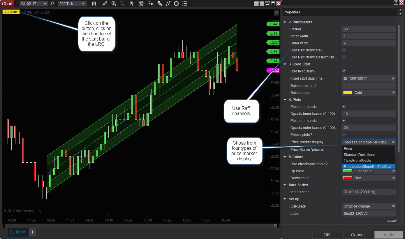 * Four different price marker displays: Price, Standard deviations, ticks from the middle line, regression slope per ticksize (which enables you to compare the slopes of other instruments)
