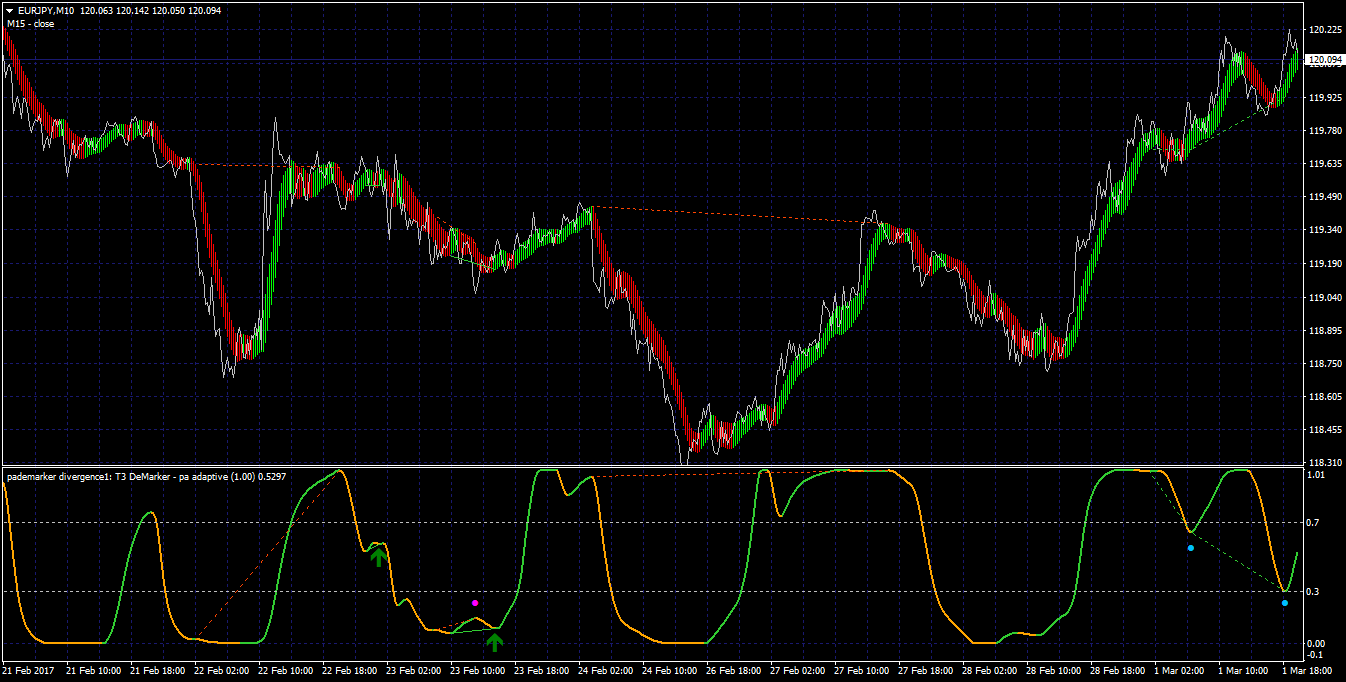 This is a Mladen's T3 Demarker with the Demarker period being controlled by phase accumulation index, indicator coloring is based on slope change as is arrows option. Indicator also has divergence.