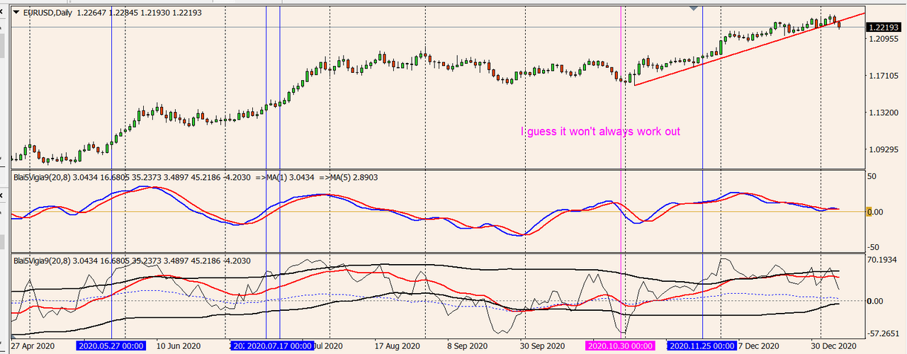 I'm aware there were more times the Vigia Signal Line broke through the lower bollinger band but the EMA was either still positive or already outside of the lower bollinger band itself when it crossed downwards through the Filter line.