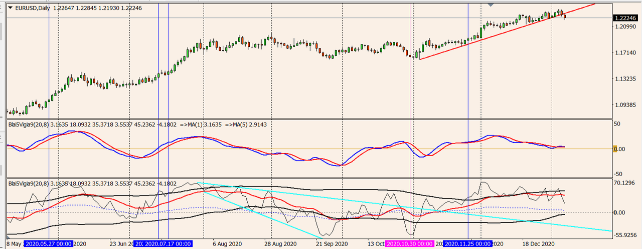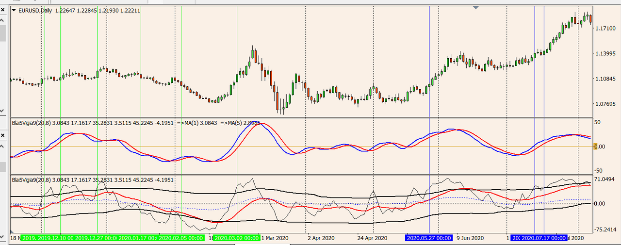 - The Signal Line or "Vigia" by default which tries to present a "harmonized" value of 4 classic indicators (RSI, Stoch, FMI and Bollinger Bands). This way, it's intention is to generate signals when the previous indicators information complements each others.