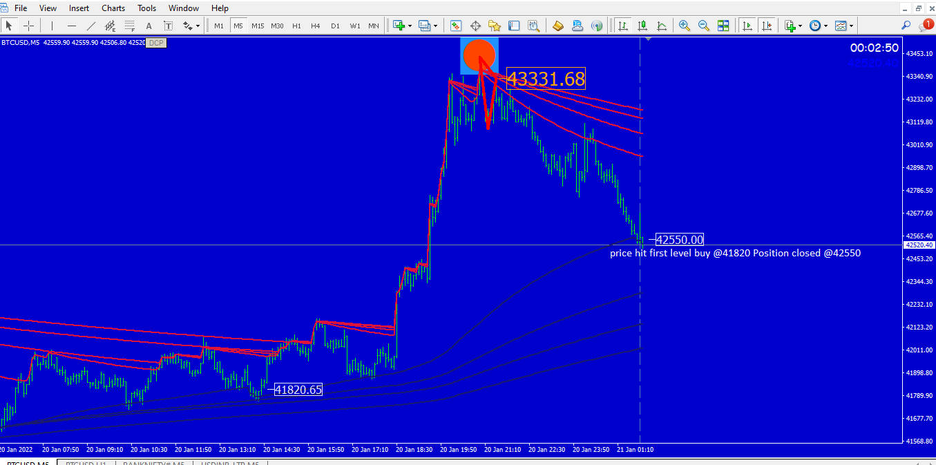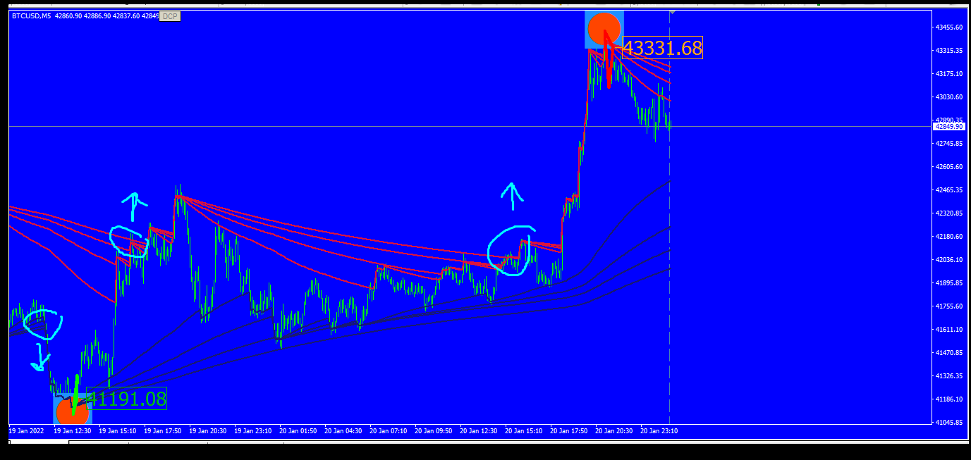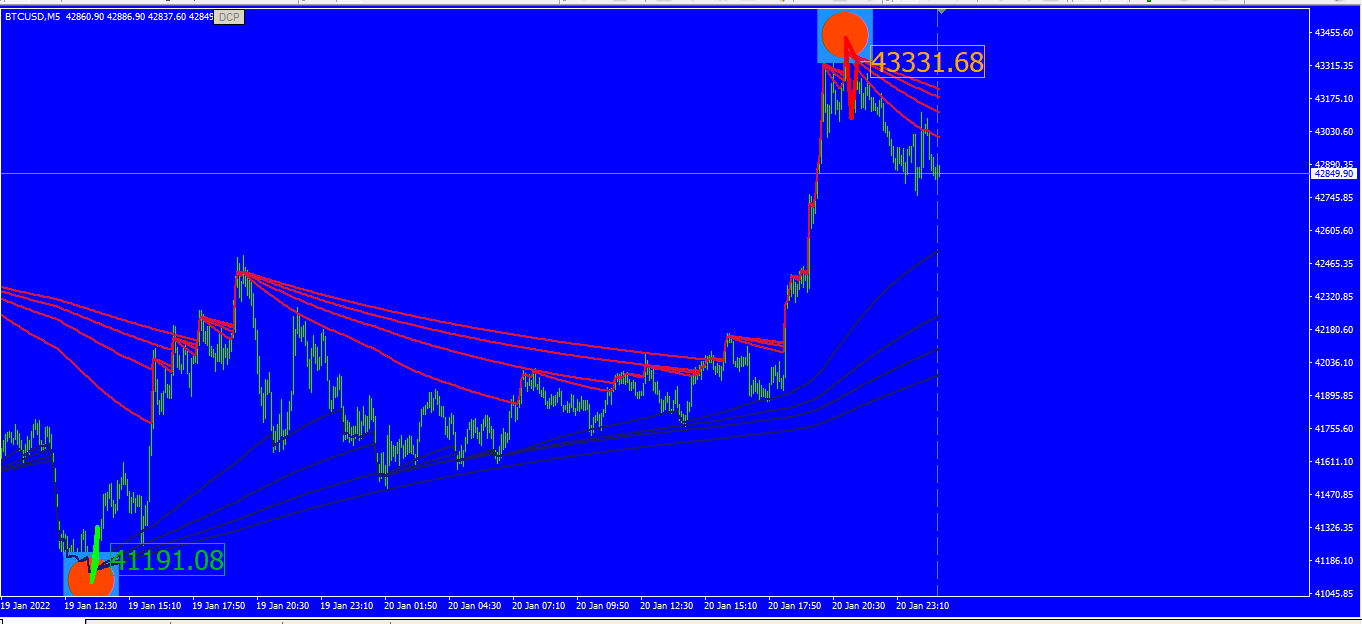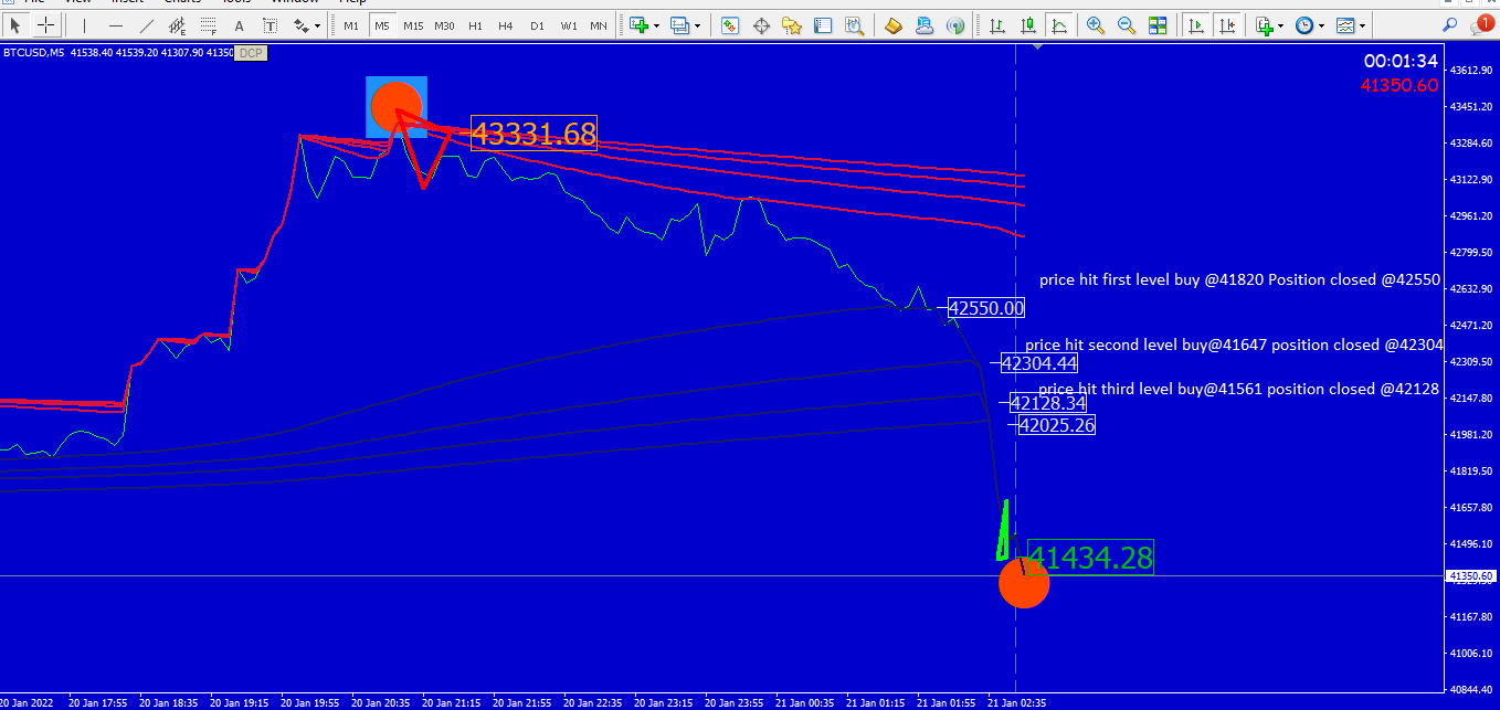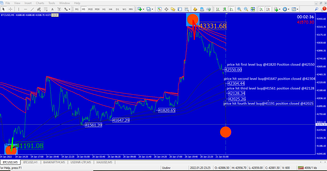 As per setup, 4 short positions (Red lines) opened as per triangle - 43331and 4 Long positions (Black lines) opened as per triangle - 41191 exists.
