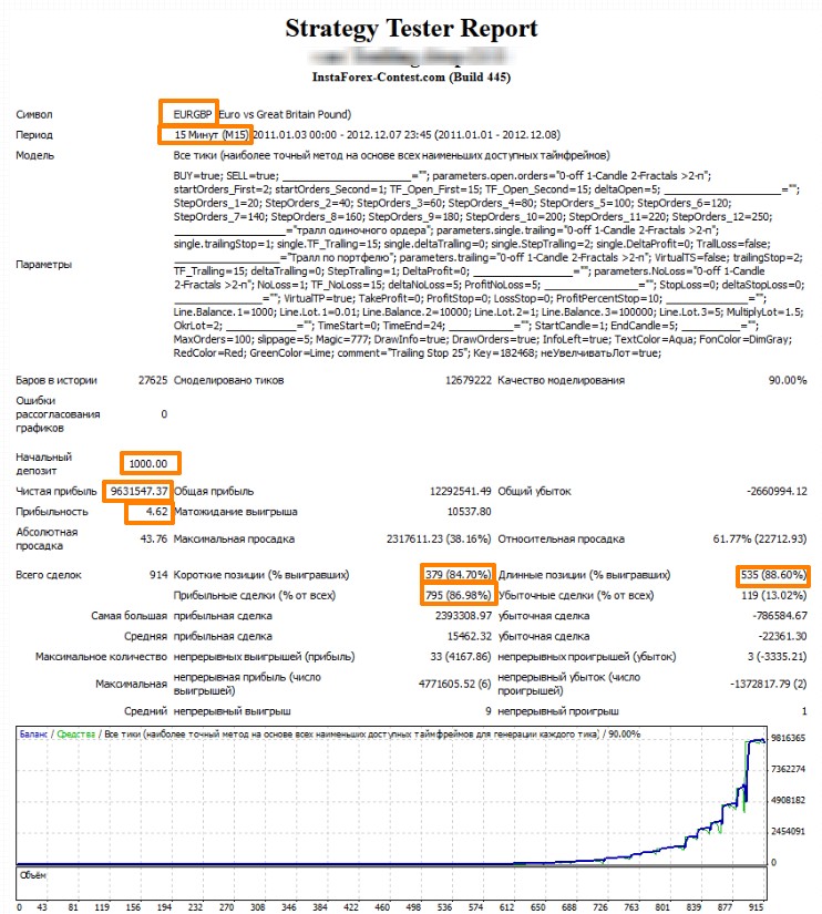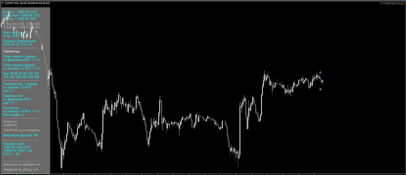 It is desirable that the adviser was not just several currency pairs at once (3-9). The adviser on EURGBP AUDCAD AUDJPY AUDNZD CADCHF AUDUSD EURUSD CADJPY EURJPY was checked, but it is possible to try and any others. It is important that there is not a lot of recoilless movement, choose pairs that in a short time 1-2 days roll back at least 20-30%. A large number of pairs can lead to blocking the work of the adviser in some brokers, where there is a limit on the maximum number of simultaneously open orders. The minimum deposit for a micro lot (0.01) and 3 pairs must be at least 500 USD, preferably 1000 USD.