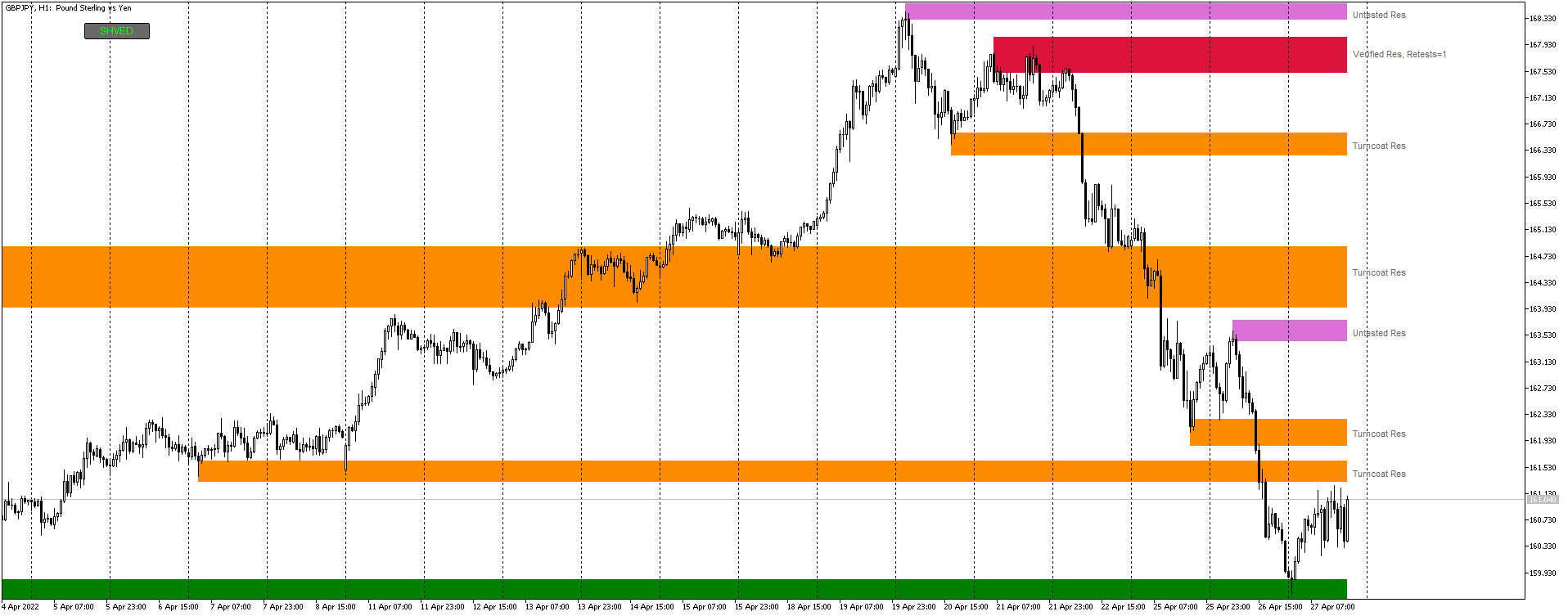 Indicator uses fractals and ATR indicator to find and draw support resistance zones on price chart. Types of zones are: