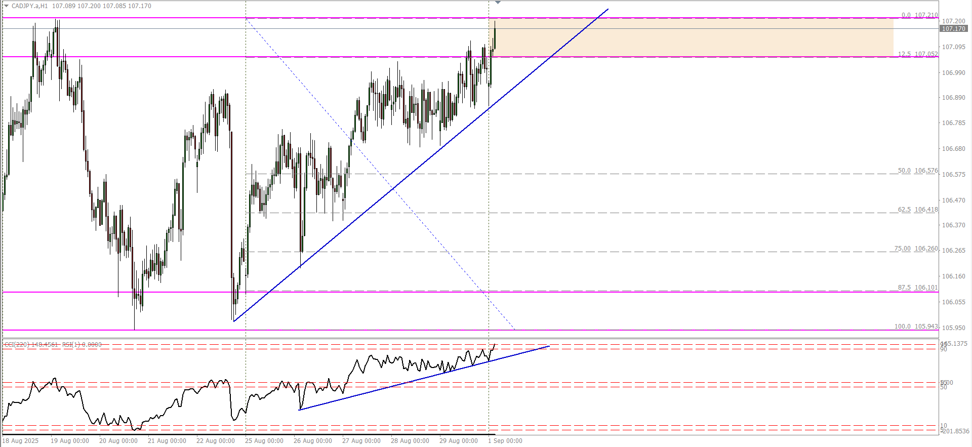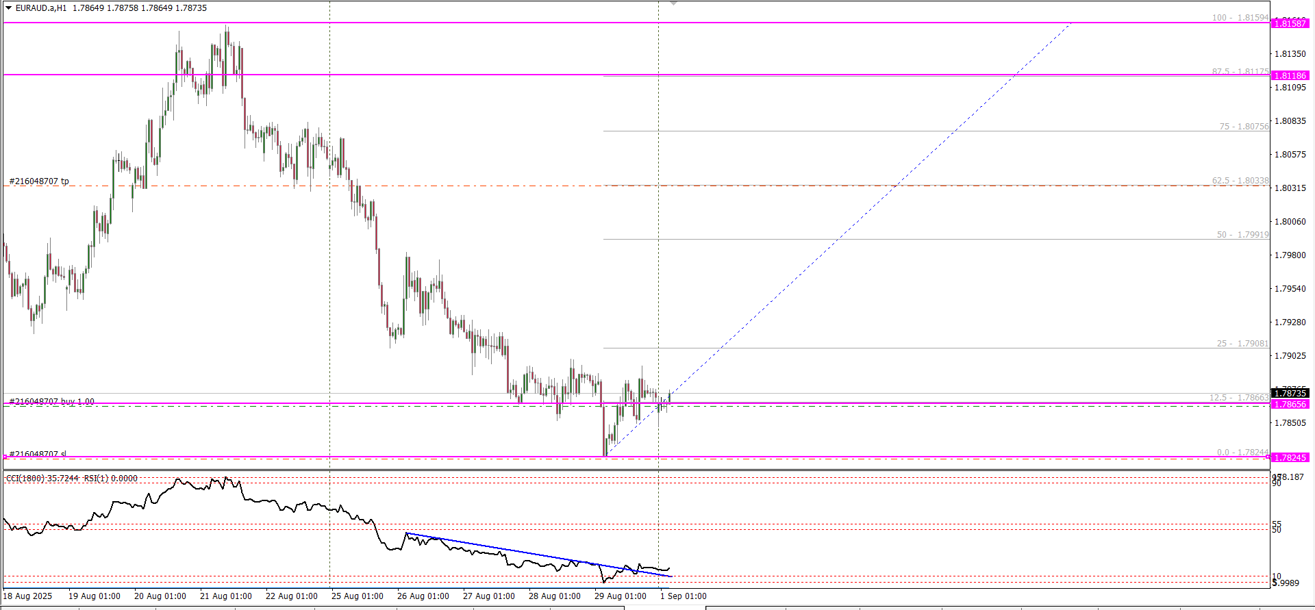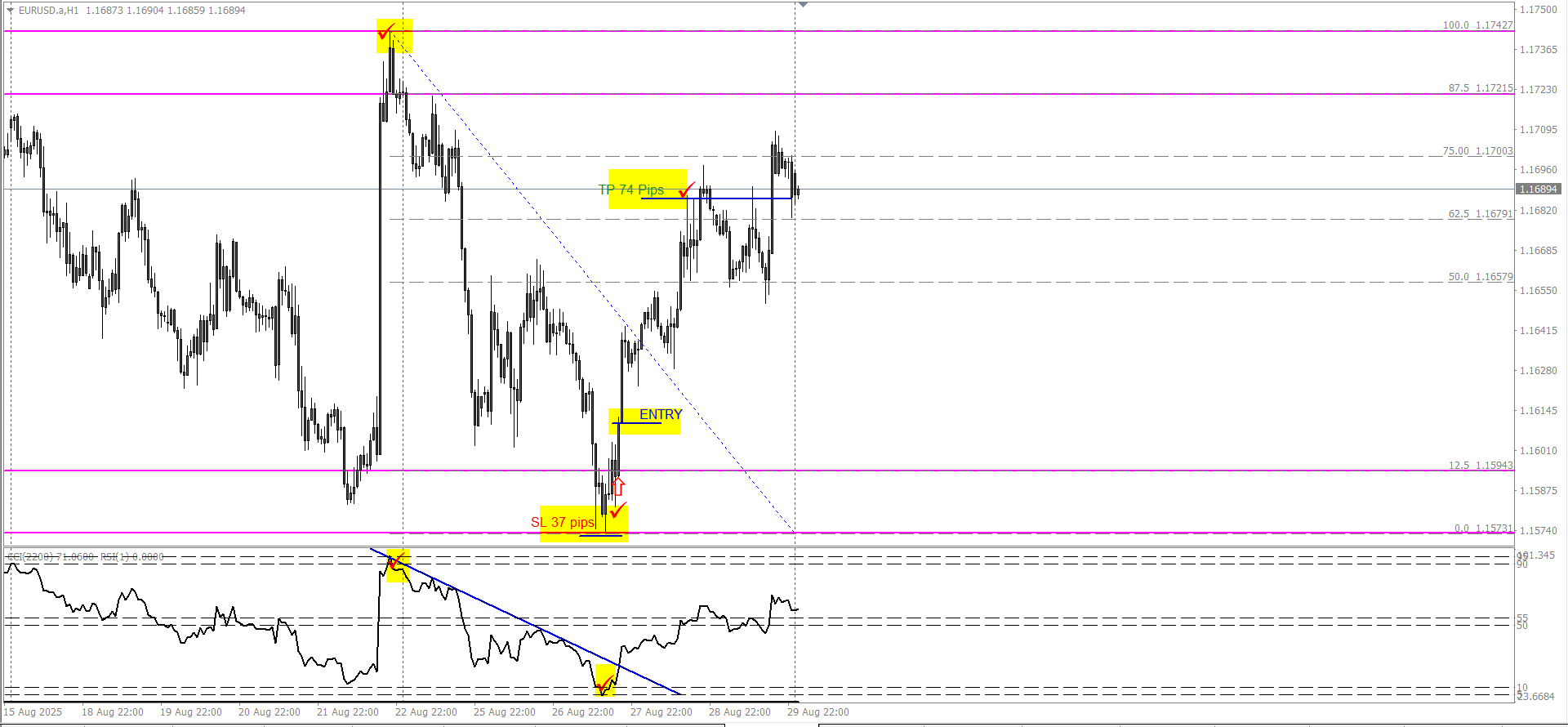 When that line gets crossed and gets below 10 level you wait for the H1 candle to close and CCI to stay above the trend line.