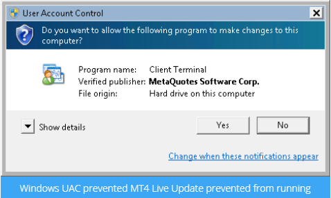 Windows UAC stops MT4 update process and asks for your confirmation. Now it’s your choice what will you answer. If you answer NO, your trading platform will not be upgraded and you will be able to use the current version you have installed. If you answer YES, then obviously MT4 will be upgraded.
