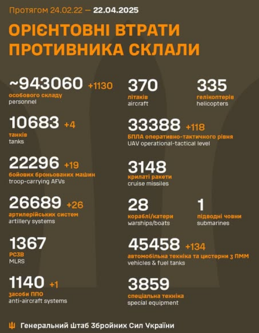 The estimated total combat losses of the enemy from 24.02.22 to 22.04.25 were approximately /