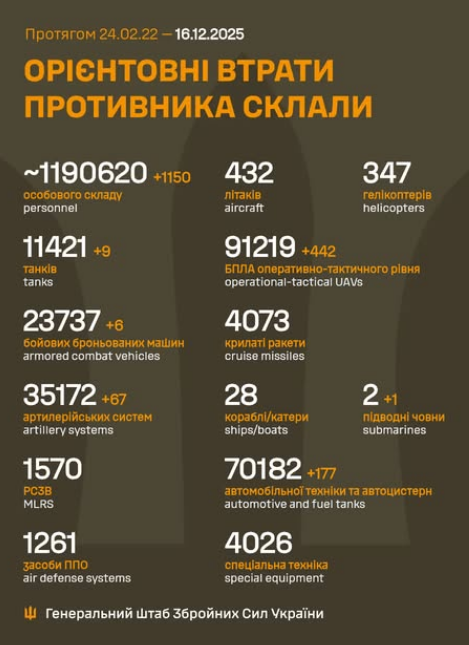 Total enemy combat losses from 24.02.22 to 16.12.25 were approximately: