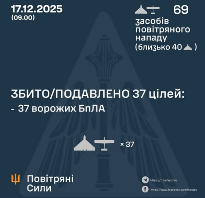 On the night of December 17 (from 18:00 on December 16), the enemy attacked with 69 Shahed, Gerbera type attack UAVs and drones of other types from the directions: Kursk, Orel, Primorsko-Akhtarsk, Millerovo - Russian Federation, Gvardiyske - TOT AR Crimea, about 40 of them - "Shaheeds".