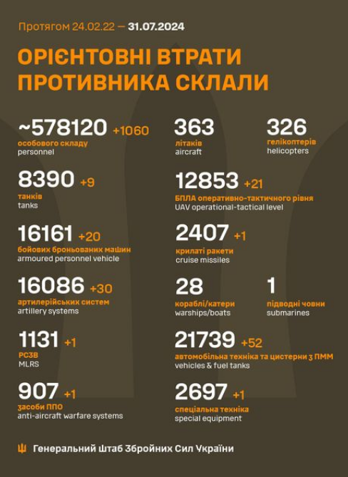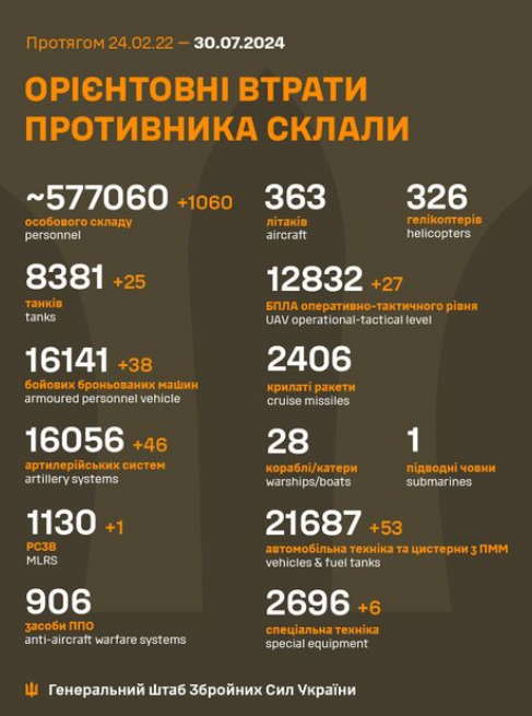 The total combat losses of the enemy from 24.02.22 to 30.07.24 were approximately: