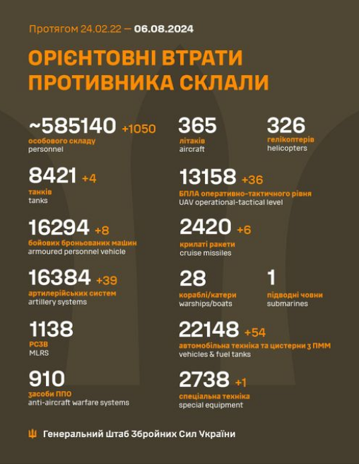 The total combat losses of the enemy from 02/24/22 to 08/04/24 were approximately: