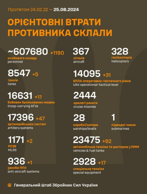 The estimated total combat losses of the enemy from 24.02.22 to 24.08.24