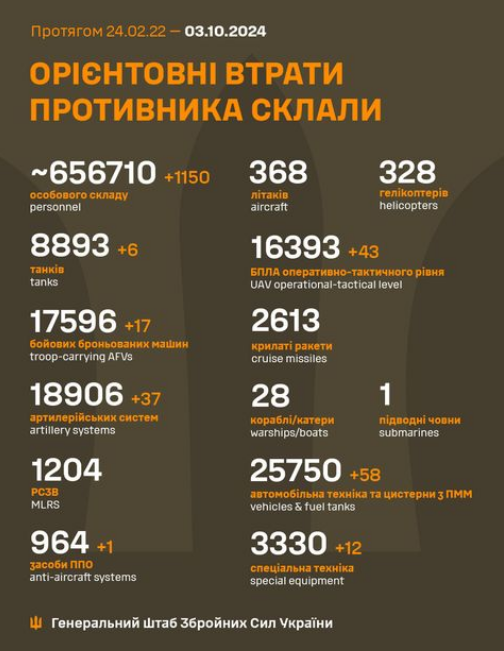 The estimated total combat losses of the enemy from 24.02.22 to 03.10.24