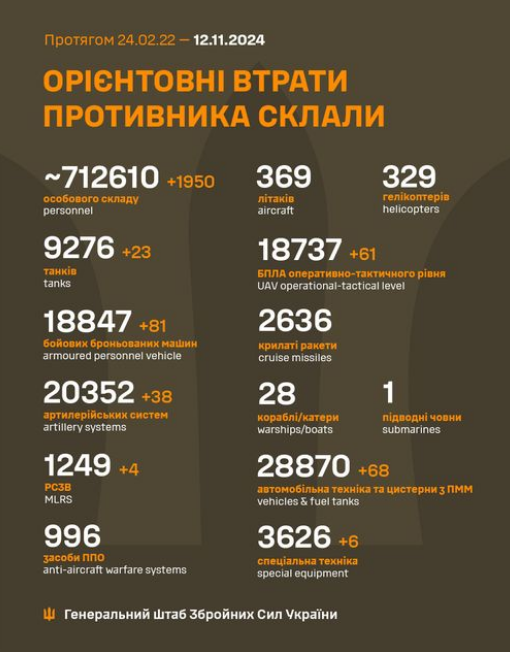 The estimated total combat losses of the enemy from 24.02.22 to 12.11.24