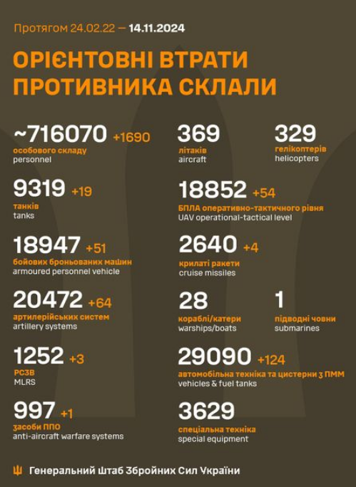 The estimated total combat losses of the enemy from 24.02.22 to 14.11.24