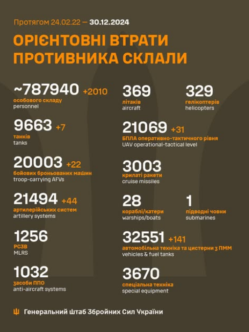 The estimated total combat losses of the enemy from 24.02.22 to 25.12.24 amounted to / The estimated total combat losses of the enemy from 24.02.22 to 25.12.24